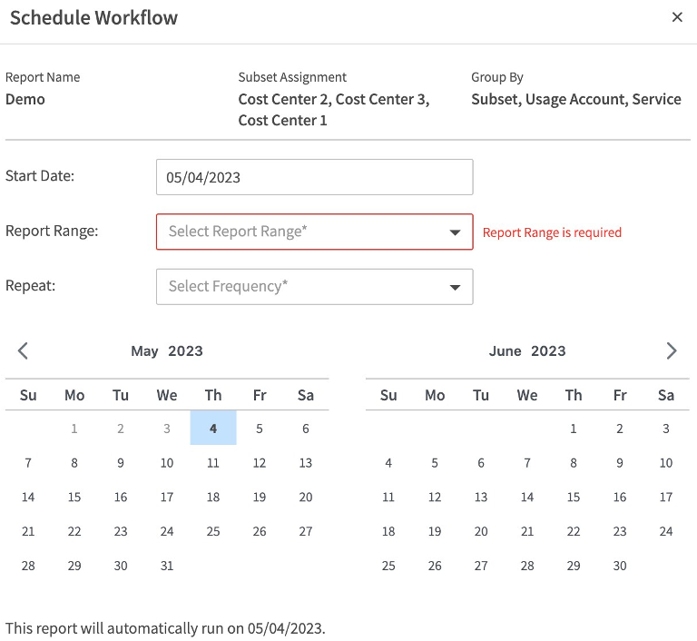 Click the report you want and select Add a Schedule. The Schedule Workflow window opens.