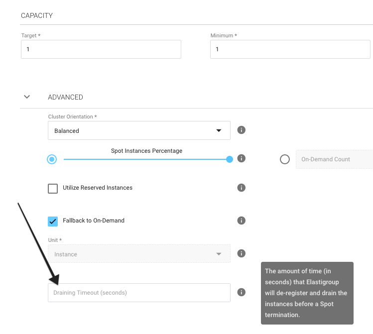 It is recommended to adjust the draining timeout for instances to 120 seconds in the General Tab of the Creation Wizard under Advanced settings.