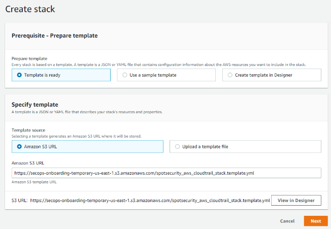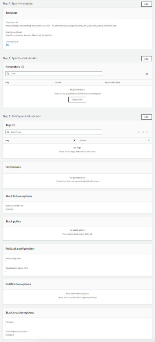 2. A window opens that is connected to AWS with the cloud formation template path. AWS uses this path to create the CloudTrail and the stack creation is a four-step process in the AWS console. The required details and permissions are automatically entered in the AWS form.